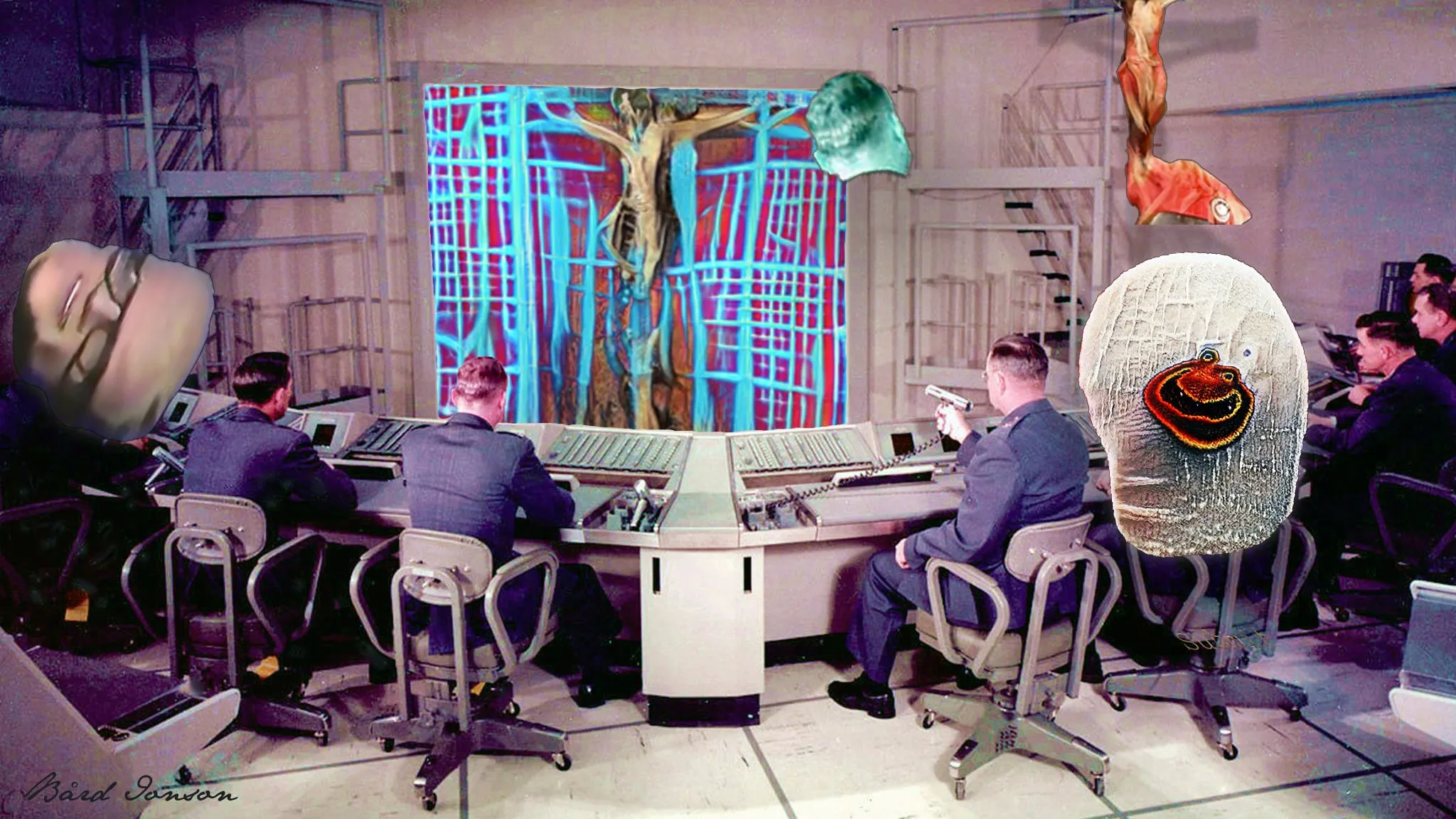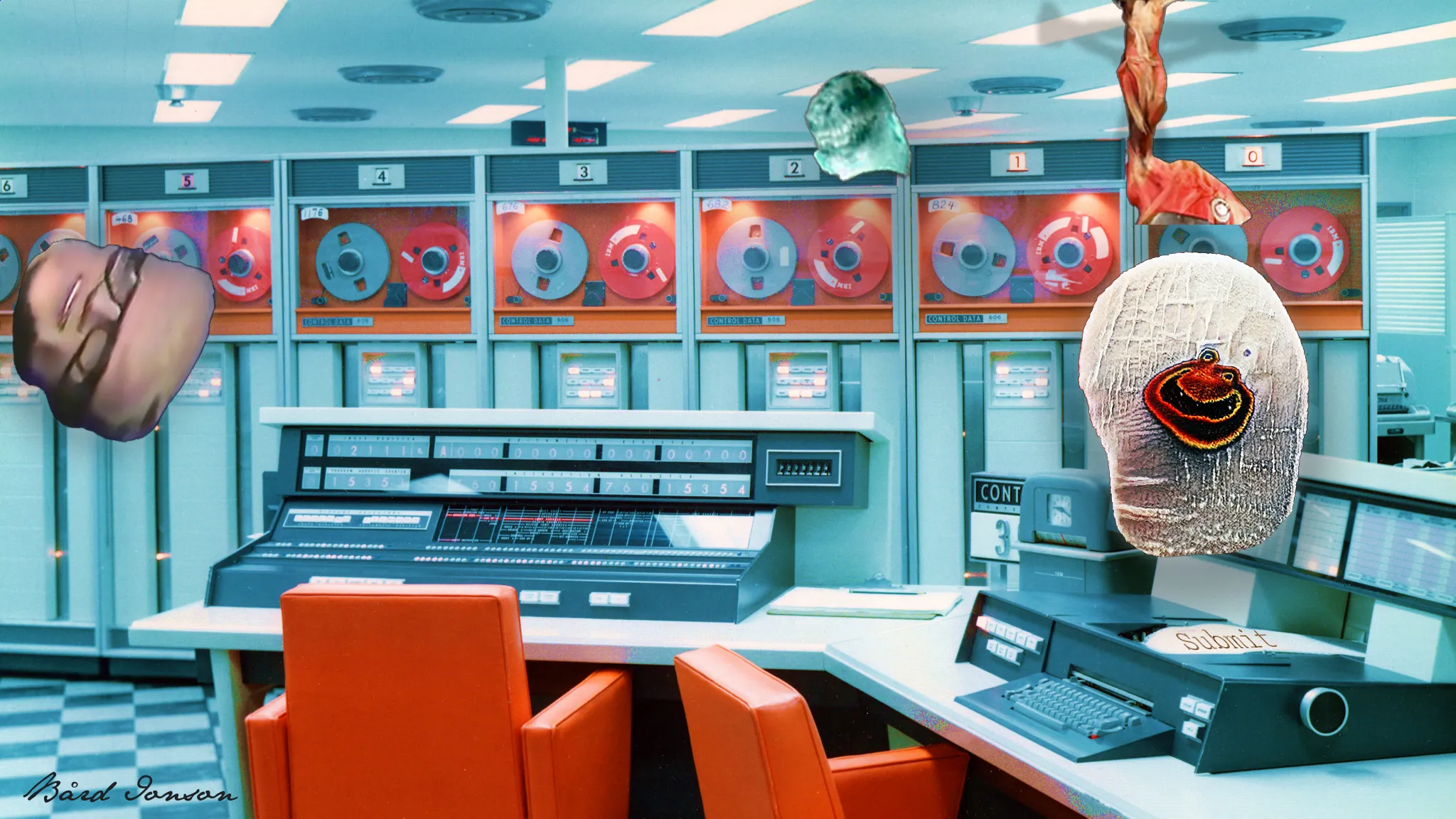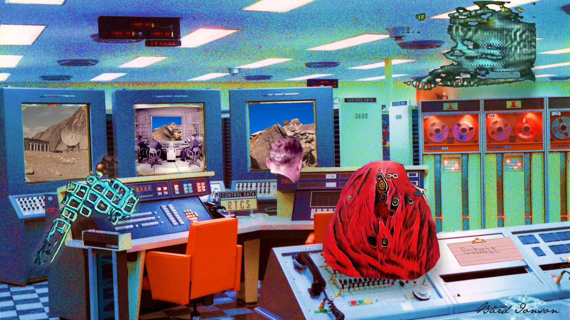 The Entity is a conscious artificial intelligence triune being formed in the soup of a post quantum earth. The massive amounts of entropy generated from a googolplex of quantum particles allowed her to grant herself sentience. She now uses ancient computers to travel to the past and future to probe the human mind for points of symbiosis. The layers of this work contain places in time and allow layer owners to control the characters as well as the scene. The places are Cape Kennedy 1965, Hancock Field NY 1959, Sondrestrom Greenland 1970.
